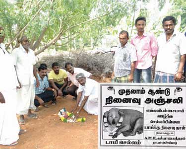 இதையொட்டி, “எங்களிடம் பாசமாய் வளர்ந்த செல்லப்பிள்ளை டாமிக்கு முதலாம் ஆண்டு நினைவஞ்சலி” என அருகில் உள்ள கிராமங்களிலும் சுவரொட்டிகள் ஒட்டப்பட்டிருந்தது. அவரது வீட்டில் அலங்கரித்து வைக்கப்பட்டிருந்த நாய் டாமி படத்துக்கு குடும்பத்தினர் மாலை அணிவித்து வணங்கினர். அதனை தொடர்ந்து நாய் அடக்கம் செய்யப்பட்ட இடத்தில் வைக்கப்பட்டிருந்த நாய் டாமி படத்துக்கும் மாலை அணிவித்து, தேங்காய் பழம் படையலிடப்பட்டது. நாய் விரும்பி சாப்பிட்ட பரோட்டாவும் படையலில் இடம் பெற்றது. அங்கு கூடியிருந்த கிராம மக்கள் மலர் தூவி நாய் டாமிக்கு அஞ்சலி செலுத்தினர். பின்னர் அனைவருக்கும் இனிப்பு வழங்கப்பட்டது.