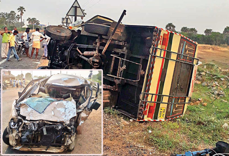 வேனில் பயணம் செய்த திருமலை நம்பி (வயது 62), அவருடைய மனைவி சுந்தரம் அம்மாள் (50), மகள் யசோதா (30), பேரன் கிருஷ்ணன் (10) மற்றும் காரில் பயணம் செய்த விழுப்புரத்தை சேர்ந்த ராஜேஷ் (35), திருத்தானூர் வசந்தராஜன் (30), குழந்தை ஏசு (25) ஆகியோர் காயம் அடைந்தனர்.